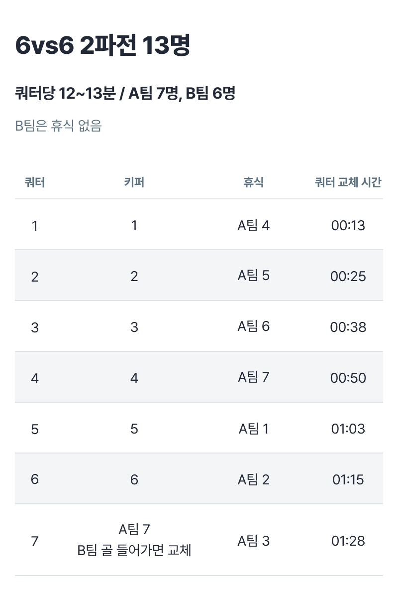 ⚽️ 최종 확정 인원이 13명이면 6vs6, 2파전으로 진행해요.