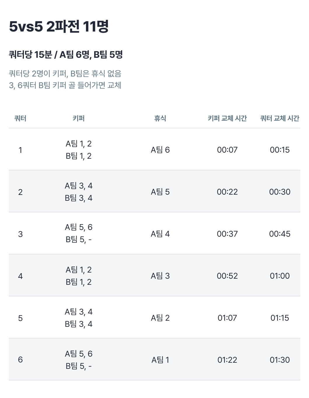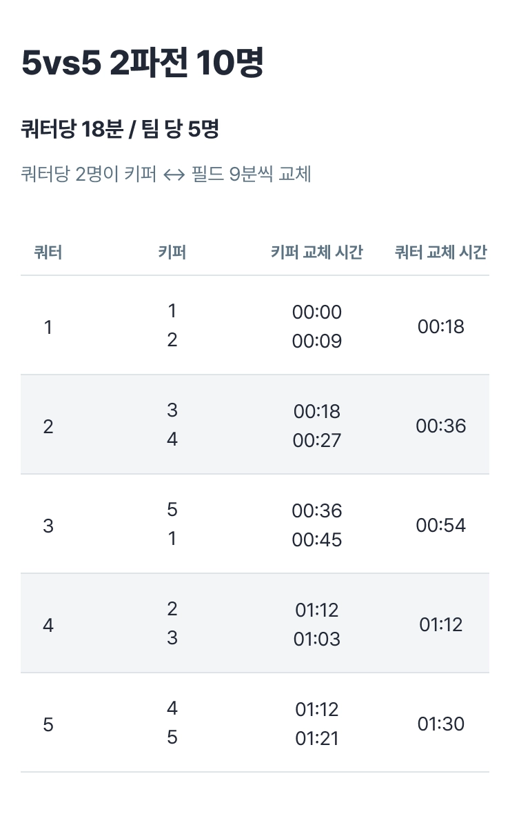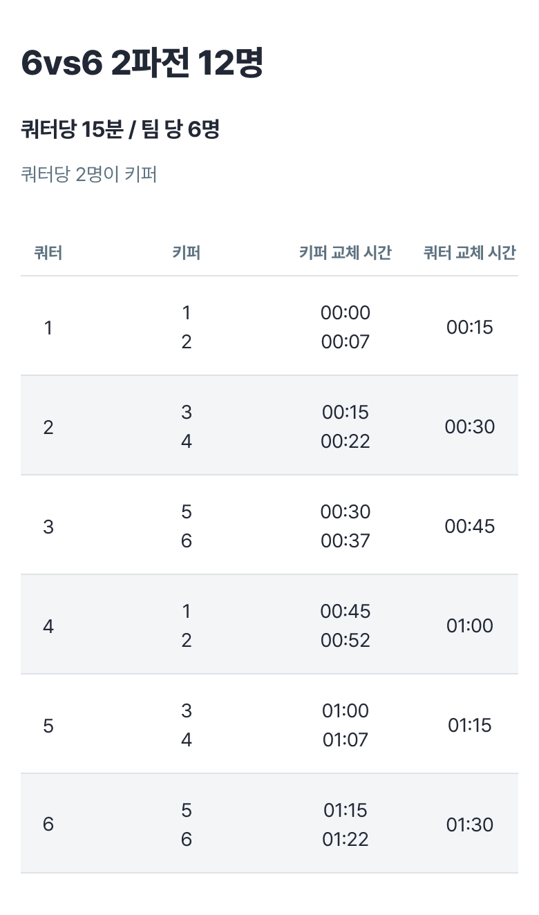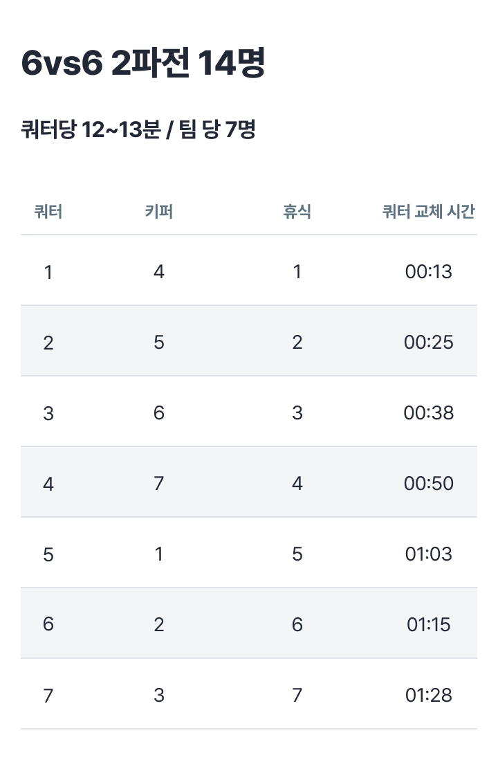 6vs6 90분 매치는 아래 로테이션으로 진행해 주세요.